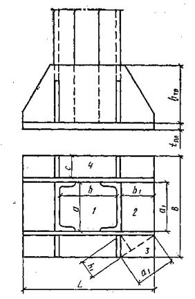 Размеры плиты В и L определяются в пределах требуемой нагрузки по конструктивным соображениям в зависимости от размещения ветвей траверсы или укрепляющих плиту ребер.