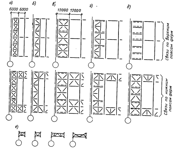 Вертикальные связи вместе с поперечными связевыми фермами по верхним и нижним поясам обеспечивают создание жестких пространственных блоков у торцов здания. К этим блокам распорками и растяжками привязывают промежуточные фермы.