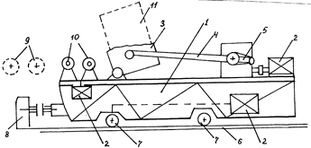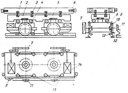 1-пісіріліп жасалған платформа; 2-тақтай; 3,6-амортизаторлар; 4,5-роликті мойынтіректер; 7-редуктор; 8-ток қабылдағыш; 9-жүрісті арбаша; 10-дөңгелек; 11-бос жүрісті жүгіршік; 12-қосымша рельс; 13-бағыттауыш роликтер; 14-электрқозғалтқыш.
