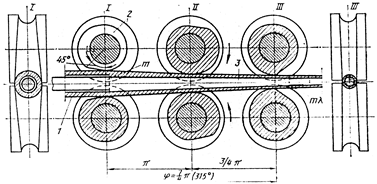 Ι-калибрлері бар пішінбіліктердің бастапқы (алдыңғы) қалпы – құбырды жаншудың басы; II – пішінбіліктердің ортаңғы қалпы; III - пішінбіліктердің ақырғы (артқы) қалпы – бастапқы құбырды беру; 1 - құбыр; 2 - калибр; 3 – конусты құралбілік.