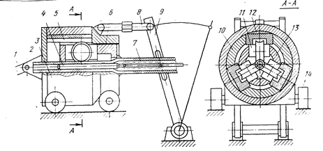 1-қосиінді-бұлғақты дезаксиальды жетектің бұлғағы; 2- дайын құбыр; 3- қалың қабырғалы тұрқы (гильза); 4-цилиндрлі құралбілік; 5-тіректі тақтайша; 6-сырғақ; 7-8- топаслы тартқыштар; 9-кулиса; 10 -құбыр; 11-тіректі шетмойындары бар роликтер;12-реттегіш сыналар; 13 – роликтерге арналған сепаратор; 14 –жүріс аунақшалары.