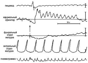Рис. . Влияние глотания (указано стрелкой) на моторику желудка. Высота вертикальных линий справа соответствует давлению 25 мм вод. ст.