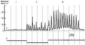 Рис. . Три типа волн сокращений желудка здорового человека (I—III) а — сокращения желудка; б — пневмограмма.[3]