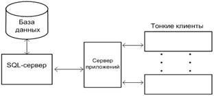 Многозвенные (многоуровневые) архитектуры позволяют обеспечить более оптимальную загрузку технических средств, чем классическая двухзвенная архитектура, и обеспечивают возможность плавного масштабирования информационной системы. Наиболее распространенным случаем является трехзвенная архитектура, в которой в качестве промежуточного слоя программного обеспечения между сервером и клиентом используется сервер приложений (рис. 1.7). Сервер приложений берет на себя существенную часть обработки данных, позволяя разгрузить и серверную, и клиентскую части.