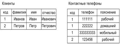 При попытке разместить все эти данные в одной таблице возникает серьезная проблема со столбцом «контактные телефоны». Обычно клиенты оставляют несколько номеров – рабочий, домашний, мобильный телефон и т.д., причем количество номеров может быть различным (допустима даже такая ситуация, когда клиент вообще не предоставляет ни одного номера). Наилучшим способом для хранения контактных телефонов будет отдельная (детальная или подчиненная) таблица, связанная с основной таблицей данных о клиентах при помощи общего столбца «личный код клиента».