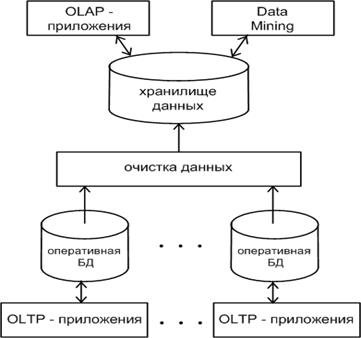 Корпоративные данные могут собираться в одной или нескольких оперативных БД, а все исторические данные концентрируются в едином хранилище, которое объединяет все данные в целях выполнения различных видов их анализа и предоставления управленческому персоналу информации, необходимой для принятия обоснованных решений по управлению бизнесом.