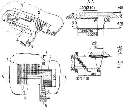 1 – покрытие; 2 - перекрытый участок входа; 3 - водосборный колодец; 4 – ступеньки входа; 5 - скрутки из 3…4 мм проволоки в четыре нити