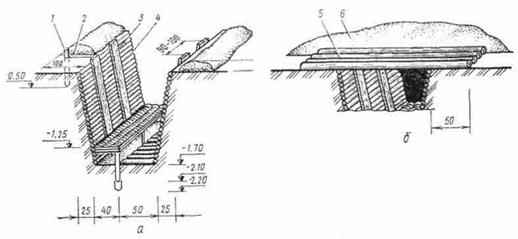 В слабых грунтах для предохранения от обрушения крутости щелей следует одевать местными материалами или бумажными земленосными мешками (рис. 10). При отсутствии круглого леса для устройства перекрытия щели могут использоваться другие местные материалы - фашины, железобетонные плиты, а также промышленного изготовления - элементы ФВС.
