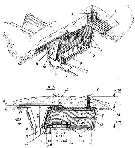 1 - перекрытый участок траншеи; 2 - герметическая дверь; 3 - подвесные нары; 4 - распорки; 5 - вентиляционный короб; 6 - накат; 7 - забирка торцовой стены; 8 - забирка продольной стены; 9 - фильтровентиляционный агрегат; 10 - места для сидения; 11 - дымовое защитное устройство; 12 - стол; 13 - печь; 14 - накат тамбура и предтамбура; 15 - блок дверной; 16 - герметизирующий занавес
