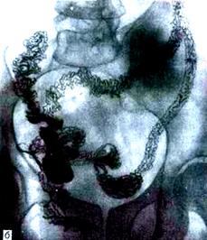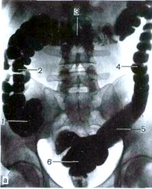Рис.302270945. Рентгенограммы толстой кишки после ретроградного заполнения контрастным веществом: 1 — слепая кишка, 2 — восходящая ободочная, 3 — поперечная ободочная, 4 — нисходящая ободочная, 5 — сигмовидная ободочная, 6 — прямая. [49]