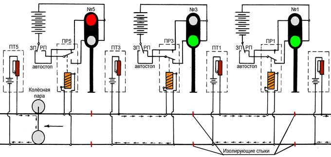 Рельсовые цепи с изолирующими стыками. Они являются основой построения системы интервального регулирования движения поездов, контролируя занятость путевых блок-участков и целостность ходовых