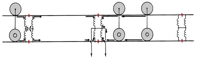 На конце рельсовой цепи обратный тяговый ток попадает из каждой нити через полуобмотку дроссель-трансформатора на среднюю точку, далее по кабелю ток попадает опять на среднюю точку уже смежного дроссель-трансформатора, затем разделяется по его полуобмоткам и перетекает в каждую нить следующей рельсовой цепи (см. рис. ниже).