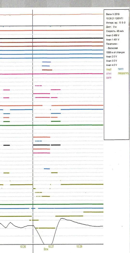 Распечатка «бурограмы», участок Печатники - Волжская - Люблино 1 путь, АРС-Днепр (см. стр 50).