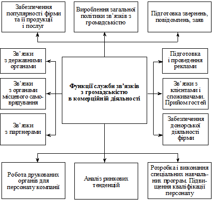 зв’язків з громадськістю, враховують пропозиції, приймаючи рішення не лише з проблем паблік рилейшнз, а й з інших напрямів функціонування фірми. Дуже важливою функцією служби ЗЗГ є підготовка звернень, повідомлень, заяв, відповідей, що стосуються інтересів фірми в усіх напрямах її діяльності. Формування пабліситі (популярності) фірми загалом і видів її продукції зокрема також є однією з важливих функцій ЗЗГ у комерційній діяльності.