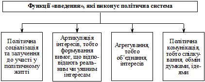 Політична система, на відміну від інших суспільних систем та організацій, наділена правом застосовувати чи погрожувати застосуванням більш або менш легітимного фізичного насильства. Габрієль Алмонд робить висновок: «Це узаконена система, яка пронизує всі «вхідні» і «вихідні» чинники суспільства, надаючи йому особливих якостей та сенсу, забезпечуючи його згуртованість як системи». Тому, на його думку, політична система виконує чотири функції «введення» (людини, соціальної групи, етносу) в політичні стосунки (схема 38).
