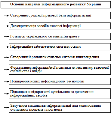 Керуючись цими документами, можна визначити такі основні напрями інформаційного розвитку України: