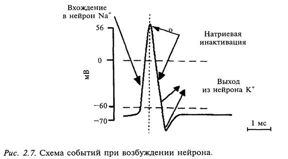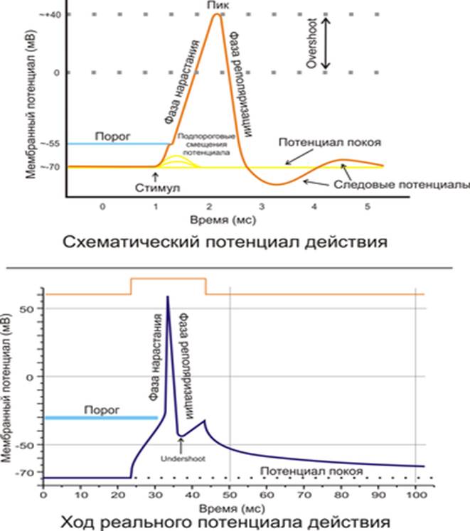 4)-6) – нисходящее колено, или реполяризация, происходит медленнее- 0,5-5,5 милисекунд. Общая продолжительность потенциала действия 1-5 милисекунд.