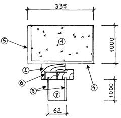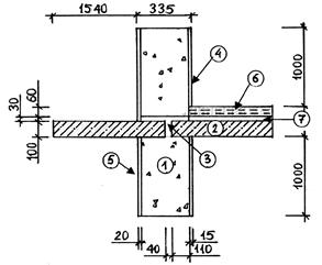| 1) керамзитобетон, g=1200 кг/м3. 2) залізобетон, g=2500 кг/м3. 3) ЦП розчин, g=1600 кг/м3. 4) ЦП штукатурка, g=1600 кг/м3. 5) опоряджувальний шар, g=1800 кг/м3 6) гіпсова плита, g=1200 кг/м3. 7) повітряний прошарок. | k перекр = 0,34 | |||