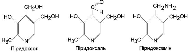 Будова і фізико-хімічні властивості. Назва піридоксин (вітамін В6) об’єднує групу близьких за складом і властивостями речовин – піридоксол, піридоксаль і піридоксамін, які є похідними піридину: