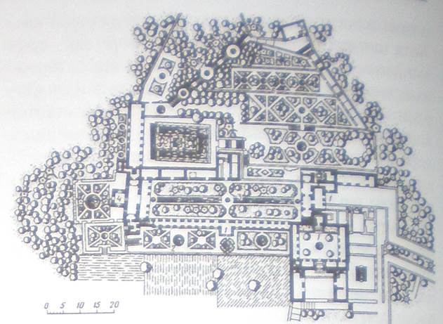 Строительный материал. Уделялось большое внимание мощению, оно было двуцветным, организовано речной или морской галькой. Использовалась майолика - цветные изразцы - ею выкладывались дно и края водоемов, облицовывались подпорные стенки и скамьи. Основные цвета – голубой, зеленый, желтый.