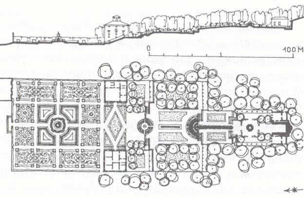 -основная часть сада была занята насаждениями в боскетах, дающими тень, обрамляющими внутренние перспективы и узлы, акцентирующими их декоративные элементы;
