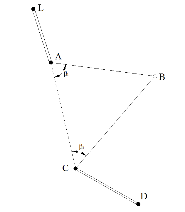 - по кутах β1 і β2 і довжинах АВ і ВС визначають на місцевості положення точки В.