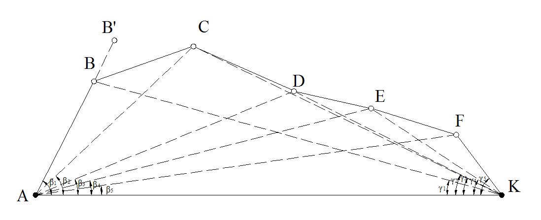 - встановивши теодоліт в точці А і орієнтувавши його за напрямком АК, послідовно відкладають кути β1, β2 , β3, β4, β5 і встановлюють віхи за напрямками АВ, АС, AD, AE, AF;