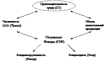 Производительность труда с одной стороны является производной показателей объема выполненной продукции и численности ППП; с другой стороны этот же показатель можно получить, определив произведение показателей фондоотдачи фондовооруженности. Таким образом, взаимосвязь показателей ПТ, его фондовооруженности и фондоотдачи материальных элементов основных фондов основана на использовании ОФ предприятия и, не только как главного ресурсного составляющего предприятия, но и важного фактора эффективности использования трудовых ресурсов.