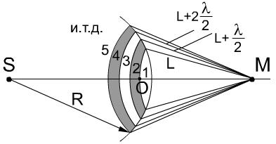 Волновой фронт разбивается на зоны таким образом, что излучения двух соседних зон, достигающее точки наблюдения гасят друг друга.