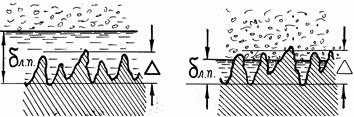 | Рис. 26. Висота виступів на стінках труби і товщина ламінарної плівки: а – гідравлічно гладка труба; б – “шорстка” труба |
