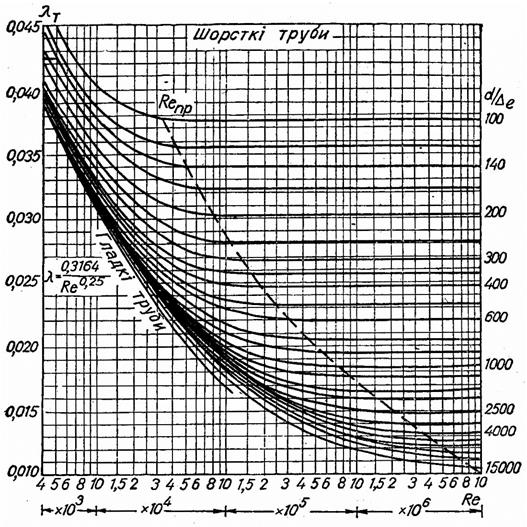 На рис. 28 зображений графік для визначення коефіцієнта λ в трубопроводах з природною шорсткістю. Цей графік відрізняється дещо від графіка Нікурадзе (рис.27), що пояснюється впливом на потік природної шорсткості.