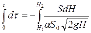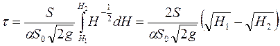 Отримане рівняння має дві перемінні. Виконавши операцію поділу перемінних і проінтегрувавши, отримаємо час витікання рідини з судини при зміні рівню її від Н1 до Н2: