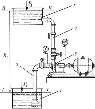 1, 3 – ємності; 2, 4 – всмоктувальний та нагнітальний трубопроводи; 5 – насос.