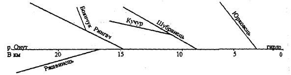 За одержаними даними побудуйте гідрографічну схему річки, взявши за приклад гідрографічну схему річки Онут (рис.15).