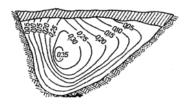 Якщо взяти поперечний переріз потоку і з’єднати місця з однаковою швидкістю лініями – ізотахами, то виникне схема, яка наглядно зображує розташування шарів різної швидкості (рис. 16, 17).