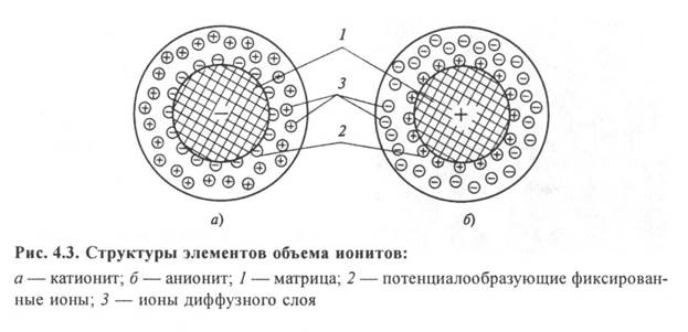 Способность ионитов к ионному обмену объясняется их специфической структурой. Ионит состоит из твердой нерастворимой в воде молекулярной сетки, к отдельным местам которой на поверхности и внутри ее массы присоединены химически активные функциональные группы атомов ионита. С электрохимической точки зрения каждая молекула является своеобразным твердым электролитом. В результате электролитической диссоциации ионита вокруг нерастворимого в воде ядра образуется ионная атмосфера, представляющая собой ограниченное пространство вокруг молекулы ионита, в котором находятся подвижные и способные к обмену ионы. Если эти подвижные ионы имеют положительный заряд, ионит называется катионитом, если отрицательный - анионитом.