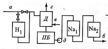 Эта схема отличается от параллельной схемы тем, что Н-катионированную кислую воду смешивают с исходной щелочной водой для нейтрализации кислотности. Затем воду направляют в декарбонизатор. Дегазированная вода насосами направляется на две ступени Na-катионирования, где полностью умягчается. Удаление свободной углекислоты перед этими фильтрами производится для получения относительно небольшой щелочности 0,2–0,5 мг-экв/кг.