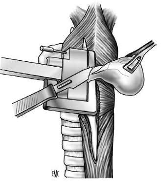 Основной операцией является удаление ДП (используются также термины «дивертикулэктомия» и «резекция дивертикула»). Такие операции, как инвагинация дивертикула в просвет пищевода и наложение анастомоза между дном дивертикула и пищеводом, сейчас оставлены. Для удаления дивертикула Ценкера применяют левосторонний доступ по переднему краю грудинно‑ключично‑сосцевидной мышцы. Эту мышцу и сосудистый пучок шеи отводят латерально, а щитовидную железу с трахеей – медиально. Находят и выделяют дивертикул до шейки. В нашей клинике был предложен и успешно используется способ эндоскопической «подсветки» дивертикула на данном этапе операции. Дивертикул отсекают после наложения на шейку сшивающего аппарата (рис. 38). Затем делают рассечение крикофарингеальной мышцы – с учетом ее роли в патогенезе заболевания – на протяжении 1,5–2 см без повреждения слизистой пищевода.