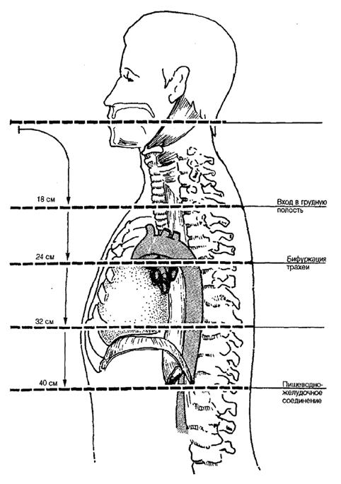 Рис. 39. Анатомические ориентиры деления пищевода на отделы: шейный, верхнегрудной, среднегрудной, нижнегрудной.