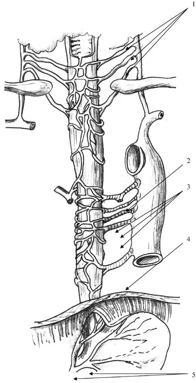 Рис. 40. Артериальное кровоснабжение пищевода: 1 – пищеводные ветви нижних щитовидных артерий; 2 – пищеводные ветви бронхиальных артерий; 3 – собственные пищеводные артерии; 4 – нижняя пищеводная артерия; 5 – пищеводные ветви левой желудочной артерии
