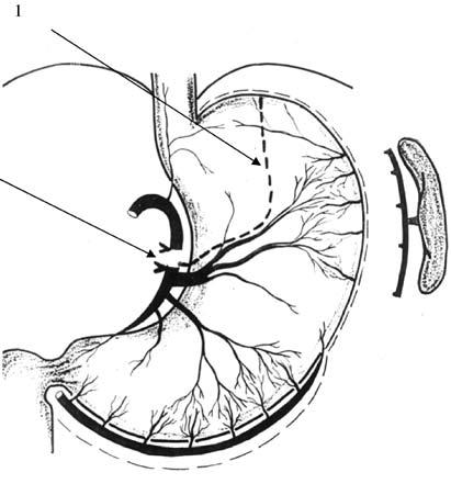 Рис. 45. Схема формирования желудочного трансплантата. 1 – линия резекции кардиального отдела желудка; 2 – место перевязки нисходящей ветви левой желудочной артерии выше отхождения ее поперечной ветви (ramus transversus)