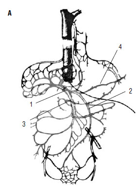 Рис. 80. Печень – это «клубок» портокавальных анастомозов А: 1 – v. portae; 2 – v. mesenterica interior; 3 – v. mesenterica superior; 4 –v. lienal.