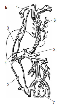 Б: 1 – v. cava superior; 2 – v. portae; 3 – v. epigastrica superior; 4 – v. umbilicalis;