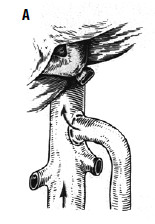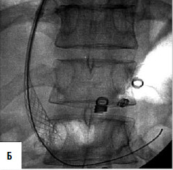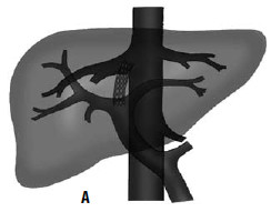 Рис. 90. Операция чрезъяремного внутрипеченочного портосистемного шунтирования (TIPS): А – схема операции; Б – этап постановки стента; В – контроль проходимости стента