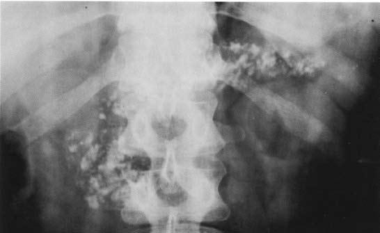 Рис. 131. Обзорная рентгенограмма органов брюшной полости (поджелудочной железы) при хроническом кальцифицирующем панкреатите. На снимке видны крупные кальцинаты в проекции поджелудочной железы на всем протяжении (во всех отделах поджелудочной железы)