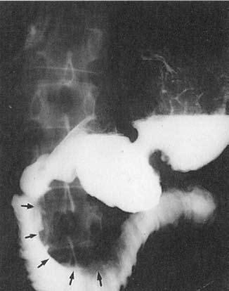 Дуоденография дает возможность судить о свободном пассаже бария через двенадцатиперстную кишку или же о наличии дуоденостаза, как уже упоминалось, имеющего значение в патогенезе ХП. Информативным методом является рентгенологическое исследование двенадцатиперстной кишки в условиях медикаментозной (искусственной) гипотонии, достигаемой предварительным введением спазмолитиков, например, атропина. Характерными признаками ХП, выявлению которых способствует гипотония, является расширение подковы двенадцатиперстной кишки вследствие увеличения размеров головки поджелудочной железы, наличие на медиальной стенке нисходящего отдела кишки широкого дефекта наполнения, иногда стенозирующего просвет и затрудняющего пассаж бария (рис. 135).