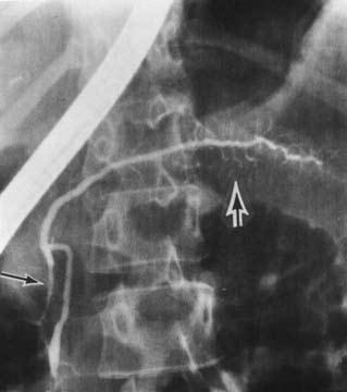 Рис. 136. Нормальная ретроградная панкреатикограмма. На снимке виден контрастированный на всем протяжении нерасширенный главный панкреатический проток (указан толстой стрелкой) и добавочный (санториниев) панкреатический проток (указан тонкой стрелкой)
