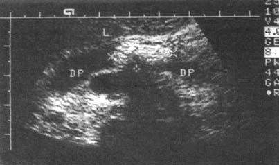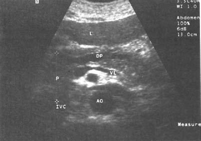 Рис. 137. Хронический панкреатит. Расширение протока поджелудочной железы (DP). L – печень; Р – поджелудочная железа; VL – селезеночная вена; IVC – нижняя полая вена; АО – аорта