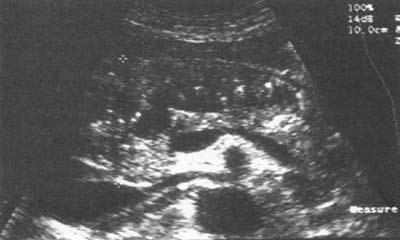 Датчик располагается в эпигастральной области и его перемещают соответственно проекции железы на области левого и правого подреберий. В норме ПЖ имеет ровные, четкие контуры и гомогенную структуру, а диаметр главного панкреатического протока не превышает 1,5–2 мм. При патологии может выявляться общее увеличение размеров органа с равномерным уменьшением эхоплотности, свидетельствующее об отеке. Уменьшение размеров железы, неоднородность структуры, наличие мелких участков уплотнения ткани, а также нечеткость контуров могут говорить о фиброзных изменениях в железе, а небольшие резко выраженные эхоположительные узелки – об очаговом обызвествлении паренхимы. Эхоструктуры высокой плотности, расположенные в протоке и дающие феномен «ультразвуковой дорожки», являются признаком внутрипротоковых конкрементов. Жидкостные образования (ложные кисты, вялотекущие абсцессы) представляются на эхограмме округлыми участками значительно пониженной эхоплотности с более или менее четкими контурами и дорсальным усилением. Хорошо сформированные ложные кисты с жидким содержимым имеют округлую или овальную форму, гомогенны и окружены четко выраженной капсулой. Содержимое несформировавшихся кист и абсцессов может быть неоднородным из‑за наличия в них, помимо жидкости, тканевых секвестров и детрита.