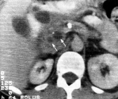 Вместе с тем встречаются случаи, когда очаговые изменения, выявленные при УЗИ, не обнаруживаются при КТ (изоденсны), или наоборот и, таким образом, оба исследования дополняют друг друга. Учитывая высокую стоимость КТ, ее применение следует считать необходимым в случаях, когда на основании УЗИ не удается создать достаточно четкое представление о патологических изменениях в ПЖ (образование изоэхогенно частично).
